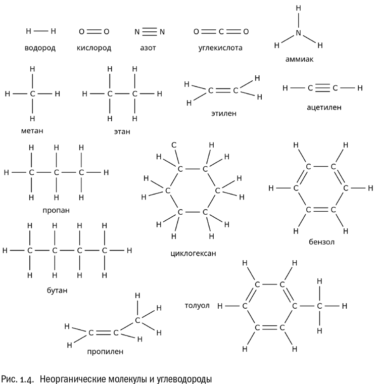 Химические соединения, состоящие только из углерода и водорода, вполне логично называются углеводородами (см. рис. 1.4). Метан – это самый простой возможный углеводород. Примеры углеводородов, следующих за ним по сложности: этан (C2H6), пропан (C3H8), бутан (C4H10), пентан (C5H12), гексан (C6H14). Основу любой из этих молекул образует цепочка атомов углерода, соединенных между собой ковалентными связями. А все валентности, свободные от углерод-углеродных связей, там занимают атомы водорода. Зная эти принципы, нарисовать структуру углеводорода с любым заданным числом углеродных атомов можно очень легко. На графических формулах видно, что несколько знакомых нам теперь углеводородов – этан, пропан, бутан, пентан и гексан – отличаются друг от друга только числом совершенно одинаковых групп – CH2–.