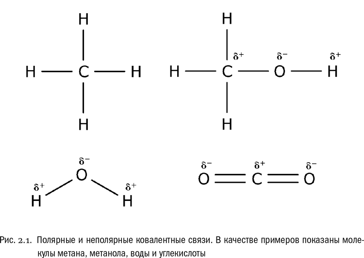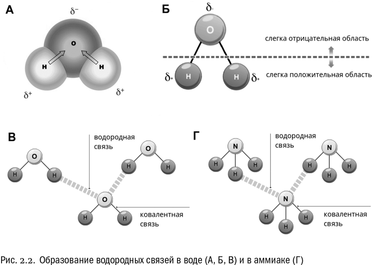 Связь между водородом и кислородом в молекуле воды – это типичная ковалентная полярная связь. Электроотрицательность кислорода намного выше, поэтому общие электроны смещены к нему. В результате на атоме кислорода образуется маленький отрицательный заряд, а на атомах водорода – маленькие положительные заряды. На графических формулах эти маленькие заряды, величина которых значительно меньше единицы, принято обозначать буквой ? (“дельта”) с добавлением соответствующего знака. Как мы теперь знаем, связи кислорода с водородом или углеродом вообще всегда полярные. Молекулы, в которых много таких связей, несут многочисленные частичные заряды, отрицательные на кислороде и положительные на водороде или углероде (см. рис. 2.1, 2.2Б).