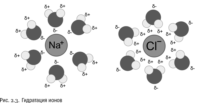 Любое вещество, растворенное в воде, так или иначе взаимодействует с ней, и способ этого взаимодействия зависит, прежде всего, от электрических свойств молекул. Например, если растворить в воде поваренную соль (NaCl), она распадется на положительно заряженные ионы натрия (Na+) и отрицательно заряженные ионы хлора (Cl–). При этом к ионам натрия молекулы воды “прилипнут” своими атомами кислорода (несущими маленький отрицательный заряд ?–), а к ионам хлора – атомами водорода (несущими маленький положительный заряд ?+). В результате и те и другие ионы получат оболочку, состоящую из молекул воды (см. рис. 2.3). Образование таких оболочек называется гидратацией. Ионы натрия и хлора находятся в воде в гидратированном состоянии. Гидратация – процесс, сопутствующий растворению в воде любого вещества (если оно вообще в ней растворимо, конечно).
