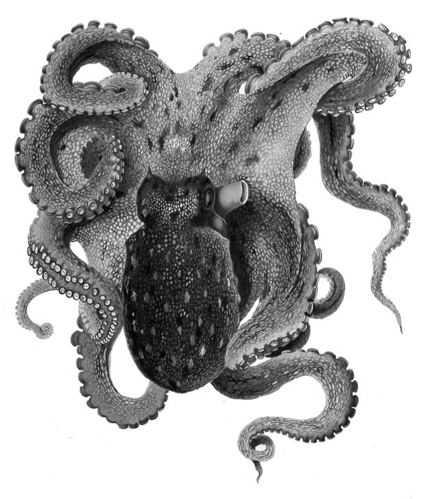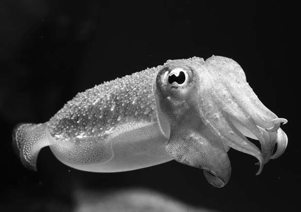 Головоногие моллюски, за исключением наутилуса[4], лишены наружной раковины. В ходе эволюции она превратилась в рудиментарное образование, спрятанное внутри мускулистого тела. Например, у каракатиц она имеет вид известковой пластинки, которая лежит под мантией и прикрывает моллюска со спины. Тонкая полупрозрачная пластинка кальмаров по форме напоминает римский меч и потому называется гладиусом. А у осьминогов остались два рудиментарных хрящевых образования, к которым прикрепляются мускулы.