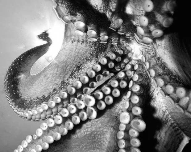 У осьминогов, как мы помним, их восемь штук, и все они примерно равной длины. Нижняя поверхность осминожьих «рук» сплошь усеяна двойным рядом цепких присосок, с помощью которых они хватают добычу и фиксируются на грунте. Одна такая присоска способна без особого труда удержать несколько килограммов, а у крупных осьминогов их около 2500 штук.