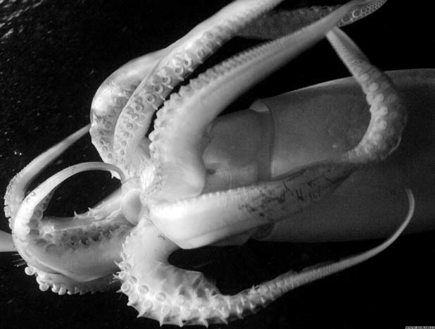 А вот щупальца кальмаров, которых насчитывается ровно десять штук, принципиально отличаются от осминожьих. Восемь из них почти что равны между собой, а пара так называемых ловчих – гораздо длиннее (у гигантского 18-метрового кальмара их длина достигает 10 метров и более).
