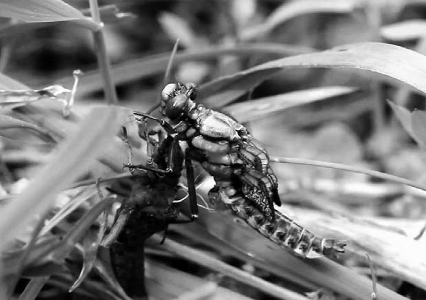 На протяжении своей личиночьей жизни (этот срок может колебаться от нескольких месяцев до нескольких лет в зависимости от вида) наяда все время растет и периодически меняет наряд – линяет (10–20 раз, опять же в зависимости от вида). Накануне последней линьки она (уже почти совсем взрослая стрекоза – у нее даже появляются зачаточные крылья) выползает на стебелек растения, торчащий из воды. Через некоторое время хитиновая броня на верхней стороне одного из грудных сегментов лопается, и новорожденная стрекоза неуклюже выкарабкивается из опостылевшей оболочки. Через несколько часов скукоженные крылья как следует расправятся, затвердеют и приобретут необходимую жесткость, и тогда юная стрекоза обретет способность летать.