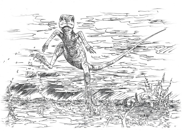 Обычно, да. Но не всегда, потому что и в царстве тихоходов обязательно должен был обнаружиться свой Иванушка-дурачок, заимевший семимильные сапоги. А, в частности, здесь «дурачку» вздумалось облачиться в тонкую чешую и, неловко переставляя длинные задние лапы, показаться из-за переломанного кустарника – в форме изящной рептилии, что размером была не больше воробушка. Ее коричнево-пестрая шкурка почти полностью терялась на фоне размытой земли, и только выкрашенное теплым рыжим цветом горлышко могло свидетельствовать, что «ящерка» пока еще не растворилась в воздухе, но всего лишь внимательно исследует приглянувшуюся ей трещину в камнях, разыскивая забившийся туда живой мусор – мелких рачков, раздавленных тараканов, стрекоз с переломанными крыльями и другие вкусности, заботливо приготовленные разлившейся рекой. Треугольная мордочка работала не хуже пинцета, а острые зубы-иголочки без труда справлялись с жесткими панцирями и добирались до мягких внутренностей, так что рептилия казалась довольной и абсолютно увлеченной своим занятием… пока внезапно самке тамбакарнифекса, изнывающей от вынужденной неподвижности, не вздумалось пошевелиться.