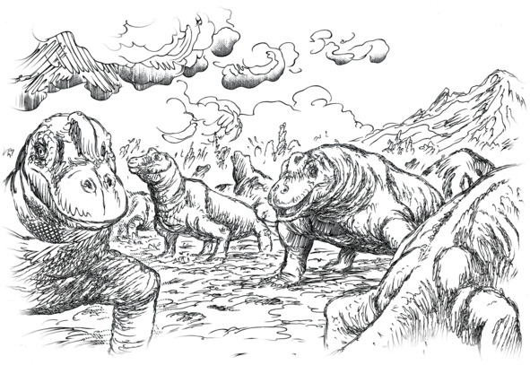 Как и современные свиньи, она никогда не гнушалась тем, чтобы разнообразить свое вегетарианское меню пищей животного происхождения, более того – это доставляло ей ни с чем не сравнимое удовольствие, особенно если получалось наткнуться на гнездо с отложенными яйцами или на чей-нибудь разлагающийся труп, гниющее мясо которого уже начало отваливаться от костей. Объемистое брюхо этой великанши без труда переваривало все, что в него попадало, справляясь даже с грубыми и малопитательными растениями среднего пермского периода, которые приходилось долго разминать многочисленными щечными зубами, дабы превратить эту жесткую массу во что-нибудь более-менее съедо…