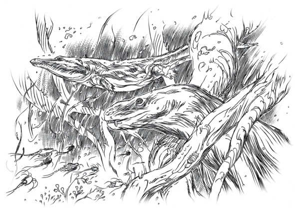 Ведь, в конце концов, несмотря на мягкую шкурку и невнушительные габариты, эти малыши тоже не лыком были шиты, и молодой самец, только что сравнительно беззаботно чистившийся по соседству с гигантской самкой титанофонеуса, едва-едва успел зарыться носом в ил и схватить себе на обед парочку выскочивших с перепугу рачков, как вдруг – ш-шух! – уже рванулся в сторону, яростно загребая лапами, и успел-таки нырнуть под старую корягу за мгновение до того, как его поймала пара длинных, зубастых и очень-очень страшных челюстей!