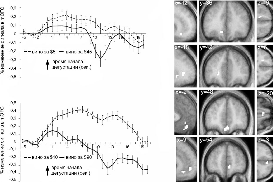 Покажется ли вам еда и питье вкуснее, если вы заплатите за них больше? Конечно, не всегда, но чаще – да, чем нет. В поддержку этих интуитивных знаний нейробиологи из Калифорнии изучили, что происходит в мозгу у людей, пьющих вино в компании (скажем, студентов), когда дается различная и иногда вводящая в заблуждение информация о цене красного вина. Бутылку вина за 5 долларов описывали правильно или наклеивали на нее этикетку с ценой 45 долларов. Другую бутылку, стоимостью 90 долларов, представляли как вино за 10, а третью оставляли со своей ценой – 35 долларов. Цену выводили на монитор в тот момент, когда крошечную порцию напитка впрыскивали в рот испытуемого. Во время одной серии экспериментов участники должны были оценить интенсивность вкуса вина, а во время другой – вынести суждение о том, насколько оно приятно.[73]