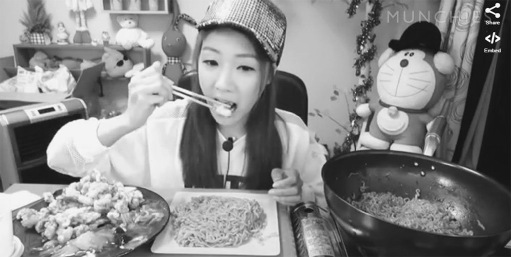 Фото 3.7. Слово «мокпан» можно перевести приблизительно как фудпорно. Прямые трансляции людей, поедающих разнообразную пищу, начались в Южной Корее в 2011 году и ныне привлекают миллионы зрителей.
