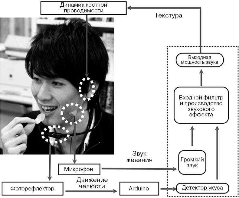 Итак, к чему готовиться молодым людям, чьи вкусовые рецепторы и, что более важно, носы пока хорошо работают? Исследователи в Японии разработали веселые наушники, которые назвали «жокеем для рта» (Mouth Jockey, фото 4.4): они распознают движение челюсти и воспроизводят заранее записанные звуки, пока пользователь ест. Вообразите, что, откусывая, скажем, кусочек мармеладного мишки, вы слышите крик. Другие работают над соломинками, способными воссоздать звуки и ощущения, возникающие при питье через соломинку: положите соломинку на коврик, где нарисован ваш любимый напиток, затем начинайте пить. Удивительно, насколько реалистичными и смешными могут быть ваши ощущения.[294]