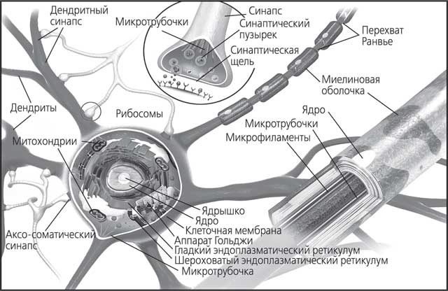 Также в нейроне есть митохондрии. В них синтезируются молекулы, снабжающие клетку энергией.