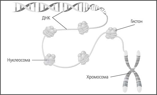 В цитоплазме, обычно ближе к центру клетки, размещается ядро с хромосомами. Это упакованные с помощью белков гистонов молекулы ДНК. На эти белки молекулы ДНК спирально накручиваются, как на катушки, а затем еще несколько раз укладываются (рис. 5). Если распутать молекулу ДНК и вытянуть в нить, ее длина составит около двух метров!