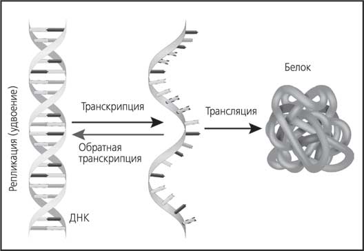На рис. 6, схематично показаны матричные (связанные с ДНК) процессы в клетке. Они называются так, потому что молекула ДНК выполняет роль матрицы-шаблона, с которой считывается информация.