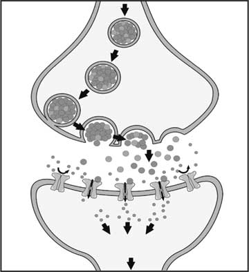 Чтобы запустить процесс передачи нервного импульса, необходимо вещество-посредник – его называют нейромедиатором. В синаптическую щель из отростка передающего нейрона выбрасывается нейромедиатор. Он связывается с молекулами-рецепторами на поверхности отростка принимающего нейрона подобно тому, как замок сочетается с ключом. Это и есть передача информации через синапс.