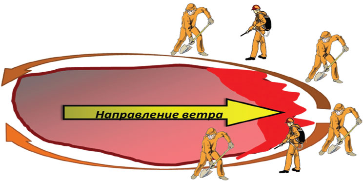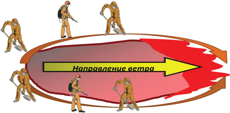 Иногда соотношение сил производительности пожарных со скоростью увеличения периметра пожара указывает на отрицательный баланс, т. е. сил недостаточно. В данных условиях тушение может быть эффективным, если сосредоточить людей не на всем периметре, а только на его фронте. Это позволяет добиться положительного баланса в пользу пожарных на конкретном участке пожара. После остановки распространения на фронтальной части пожара, которая составляет 25-30 % от общего периметра пожара, происходит уменьшение скорости увеличения периметра в 2-4 раза. В этих условиях наступает положительный баланс между производительностью имеющихся сил тушения и распространением лесного пожара. В тактическом смысле прием охвата пожара с фронта является наиболее эффективным, в том числе в условиях недостатка сил и средств тушения.