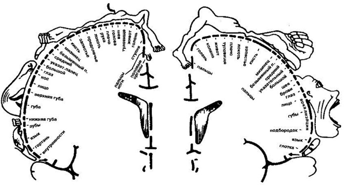 Рис. 13. Корковая проекция чувствительности и двигательной системы