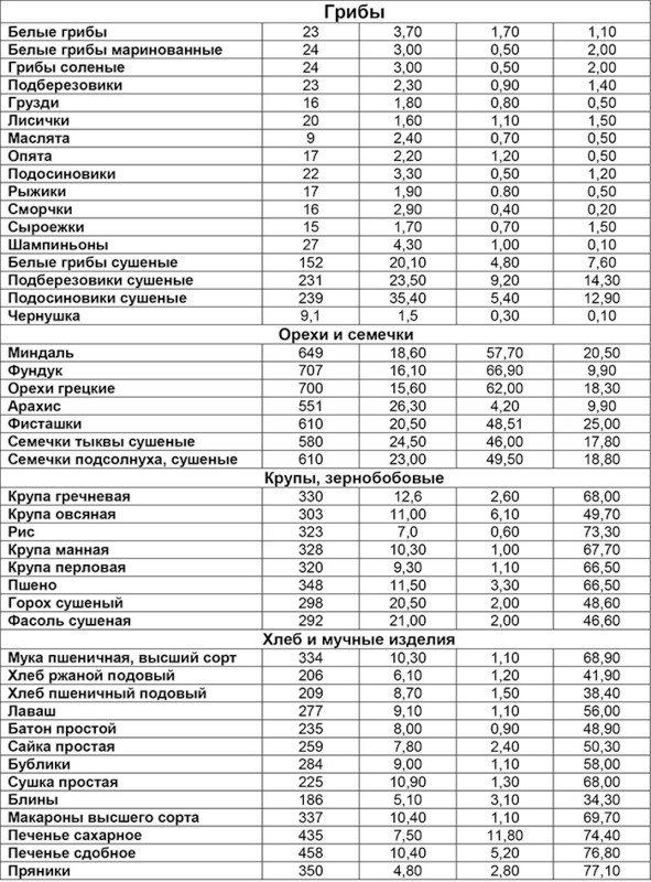 В приводимой далее табл. 1 приводятся сравнительные данные грибов и других продуктов питания.