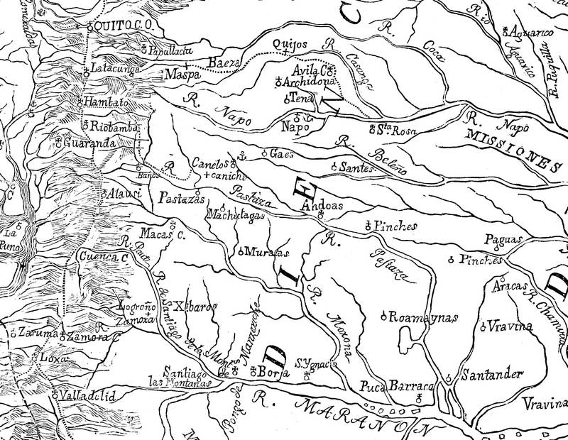 Рис. 1. Территория, представленная на этом фрагменте карты XVIII века, приблизительно совпадает с современными андскими и амазонскими областями Эквадора. Авила (в верхней центральной части карты) считалась миссионерским центром (что обозначено крестом). Пешие тропы (обозначенные пунктиром) соединяли ее с другими подобными центрами, например, с Арчидоной, а также с судоходной рекой Напо (приток Амазонки) и с городом Кито (вверху слева). Расстояние по прямой между Кито и Авилой составляет примерно 130 км. На карте представлены некоторые примеры исторического наследия колониальных сетей, опутывающих Авилу, хотя ландшафт с тех пор, безусловно, изменился. На карте отсутствует Лорето, важный колониальный город, находящийся примерно в 25 км к востоку от Авилы. Однако он занимает важное место в жизни руна из Авилы и в этой книге. Источник: Requena, 1779 [1903]. Из коллекции автора
