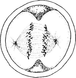Хромосомы расходятся под действием веретена деления к противоположным полюсам клетки: это начало деления зиготы (оплодотворенной яйцеклетки)