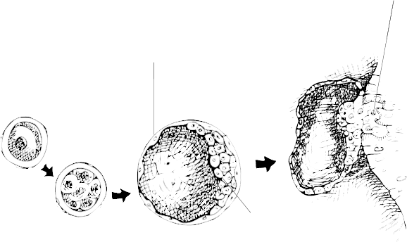 Спустя неделю после оплодотворения, то есть в то время, пока эмбрион плывет в матку, внутри скопления его клеток образуется наполненная жидкостью полость. Зародыш перестает быть морулой; он превращается в бластоцисту – это слово образовано от двух древнегреческих корней – «бластос» – зародыш и «кистос» – пузырь. Масса внутренних клеток бластоцисты распределена в ее полости неравномерно. На одном конце она сильно выступает внутрь полости. Таким образом, у зародыша возникает полярность. Возможно, вам это не покажется важным, но такое неравномерное распределение означает, что развивающийся эмбрион приобрел ориентацию. Независимо от того, в каком положении бластоциста дрейфует по полости матки, она отныне имеет свою постоянную внутреннюю ориентацию. У клеток этой внутренней массы иная судьба, нежели у наружных клеток.