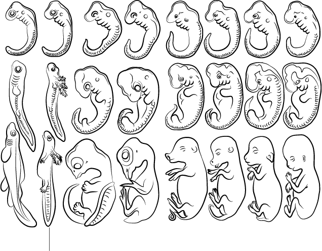 Немецкий ученый Эрнст Геккель, будучи горячим сторонником теории Дарвина, написал популярную книгу по биологии, морфологии и эволюции. Несмотря на возражения фон Бэра, теория рекапитуляции сохраняла прочные позиции в середине XIX века, и Геккель снабдил ее эволюционным обоснованием. Геккель считал, что эволюционные изменения происходят благодаря добавлению новых изменений в конце периода эмбрионального развития. Это означало, что эмбриональное развитие организма является точным отражением последовательности эволюционного развития. Так, например, человеческий эмбрион, как и следовало ожидать, проходит в своем развитии стадии, на которых он последовательно напоминает рыбу, амфибию, рептилию и только ближе к концу эмбрионального периода – млекопитающее. Геккель очень афористично выразил свою мысль: «Онтогенез повторяет филогенез». Другими словами, эмбриональное развитие повторяет эволюционную историю животного.
