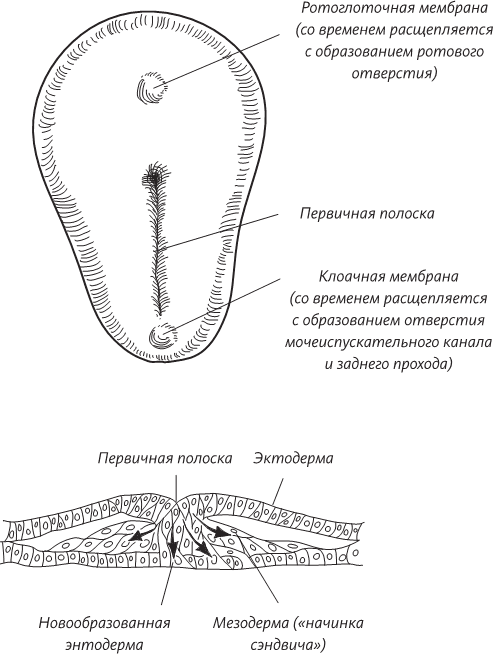 Теперь, в начале третьей недели внутриутробного эмбрионального развития, в зародыше начинают происходить весьма интересные события. Поставим внетелесный, мысленный эксперимент. Представьте себе, что эмбрион увеличился в несколько сотен раз, а вы плаваете в амниотической полости и смотрите на поверхность эпибласта, который, правда, больше похож на раздавленную грушу, нежели на диск правильной формы. (Помните, что странный плоский объект – это вы через две недели после зачатия.) Эта уплощенная грушевидная структура уже имеет передний конец (это ее расширенная часть) и задний конец, а также левую и правую стороны. Одновременно на поверхности эпибласта начинает происходить нечто странное: в середине его диска образуется бороздка, похожая на геологическую складку на поверхности земли. Размножающиеся клетки эпибласта смещаются к этой бороздке, а затем словно проваливаются в нее, как в пропасть. Попутно эти клетки оттесняют клетки гипобласта и на их месте образуют новый клеточный слой. Этот слой занимает промежуточное положение между исходными двумя – эпибластом и гипобластом.