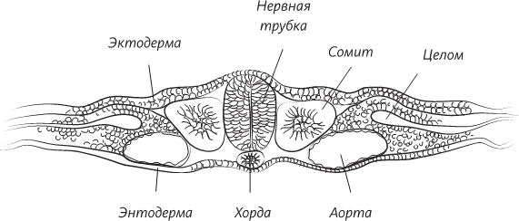 Поперечный разрез человеческого эмбриона в конце третьей недели внутриутробного развития. Эмбрион все еще представляет собой плоский диск, но нервная трубка уже сформирована, а мезодерма по обе стороны от нервной трубки уже образует утолщения, называемые сомитами. Уже сформированы кровеносные сосуды – по одной аорте с каждой стороны тела. Целом – это предшественник полостей тела ребенка: выстланных мезодермальными клетками мешков, одевающих легкие, сердце и кишечник
