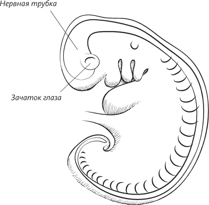 На четвертой неделе внутриутробного развития новообразованная нервная трубка, слегка расширенная на переднем конце, разительно напоминает нервную трубку примитивного хордового животного, такого, как ныне живущие ланцетники или древние вымершие хайкоуэллы. Человеческому мозгу предстоит еще долгий путь дальнейшего развития, а мозг ланцетника у взрослого животного представляет собой именно легкое расширение на переднем конце нервной трубки и едва ли превосходит сложностью спинной мозг. У позвоночных, включая и нас, более сложный мозг начинает формироваться уже в эмбриональном периоде; передний конец слепо заканчивающейся нервной трубки расширяется, образуя три соединенных между собой пузыря, из которых развиваются передний мозг, средний мозг и задний мозг соответственно. Развитие заднего мозга контролируется генами семейства Hox, определяющими план строения тела у многоклеточных. Эти гены имеют очень древнее происхождение – варианты этого гена присутствуют у плодовой мушки, а наш общий с ней предок жил около 800 миллионов лет назад. Области переднего и среднего мозга формируются под влиянием более молодых генов, которые возникли после эволюционного расхождения первично- и вторичноротых, но перед возникновением хордовых животных.