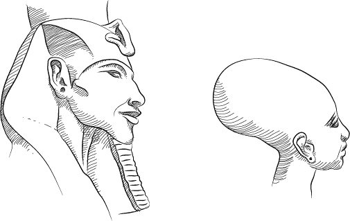 Череп новорожденного младенца очень податлив. Его можно легко деформировать – случайно или преднамеренно. Преднамеренную деформацию детских черепов практиковали в Древнем Египте, Древней Греции, Перу и Австралии. Причудливая форма черепа должна была свидетельствовать о социальном статусе его обладателя, о его титуле, принадлежности к определенной группе. Деформированный череп был знаком принадлежности к политической или военной элите. Голова египетского фараона Эхнатона, похоже, была деформирована в результате заболевания, но скульптурные портреты его супруги Нефертити позволяют предположить, что ее череп имел удлиненную коническую форму. На мумиях Тутанхамона и его матери также заметны следы конической деформации черепа. На изображениях видно, что у всех фараонов продолговатые черепа, и видно, что это не дань художественной моде того времени – черепа египетских фараонов действительно были целенаправленно деформированы.