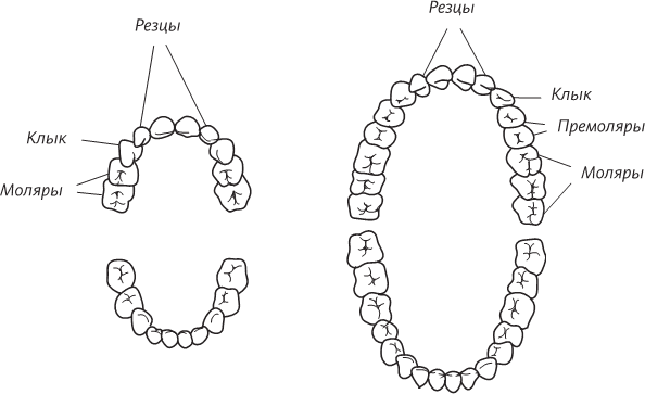Когда я рассматриваю найденный археологами скелет и стараюсь определить пол взрослого человека, настоящим даром является хорошо сохранившийся череп. Даже если отсутствуют тазовые кости или они фрагментированы, то по черепу всегда можно определить, кому принадлежал скелет – мужчине или женщине. По зубам, кроме того, можно определить возраст человека в момент смерти. Если зубной набор незрелый, то возраст установить очень легко, потому что разные зубы формируются и прорезаются в разные возрастные периоды в жестко определенной последовательности. К трехлетнему возрасту во рту младенца присутствуют двадцать молочных зубов; в каждом квадранте (то есть в половине челюсти) есть два резца, один клык и два коренных зуба (моляра). Через три года ребенок начинает терять эти зубы, и на их месте прорезаются постоянные зубы: их в конце концов будет тридцать два, включая и третьи моляры (зубы мудрости), если, конечно, вы не принадлежите к 10–20 % населения, у которых не прорезаются третьи моляры. Детские резцы и клыки сменяются более крупными резцами и клыками, а детские моляры сменяются премолярами (малыми коренными зубами) с двумя бугорками на жевательной поверхности, а за премолярами следуют три взрослых моляра (больших коренных зуба), которые занимают места на выросших челюстях позади молочных зубов. Первый постоянный большой коренной зуб прорезается приблизительно в шесть лет, второй в двенадцать, а третий – в восемнадцать.