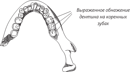 Сейчас мы едим мягкую, обработанную пищу, и наши зубы стираются не так быстро, как у предков, питание которых было более грубым. Достаточно сказать, что в хлебе часто попадалась мелкая пыль от каменных жерновов. Несмотря на то что эмаль – это самое твердое и прочное вещество в человеческом организме, способное перетирать самую грубую пищу, она все же со временем изнашивается, обнажая дентин – ядро зуба, и поэтому показателем возраста может служить степень стертости зубной эмали. Дентин обнажается в первую очередь на концах зубов, вдоль режущих краев резцов и на бугорках премоляров и моляров. Идут годы, у моляров постепенно стираются и исчезают бугорки жевательной поверхности. Поверхность становится ровной и представлена дентином, так как одновременно с бугорками стирается и эмаль, которая сохраняется лишь в виде ободка вокруг боковой поверхности. Зуб может стереться до такой степени, что эмаль полностью исчезает, а от зуба остается лишь небольшой выступ над корнем. Я – современный человек, и мой рацион не такой грубый, каким он был бы, живи я несколько столетий назад. Тем не менее, когда я чищу зубы, я иногда смотрю на них в зеркало и вижу, что бугорки на коренных зубах пока выражены очень хорошо, но зато на краях резцов уже проступила узкая полоска дентина. То есть мои зубы медленно, но верно стираются. Так что имеет смысл и вам оценить состояние своих зубов.