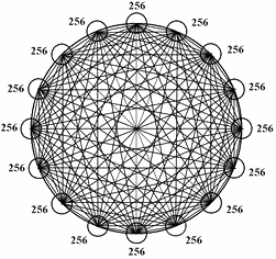 Здесь предполагается, что каждый носитель может быть связан в данный момент времени только с каким-то одним носителем в своем и любом другом клаттере сети. Для сети 256 добавочная связь на каждый клаттер, даст дополнительно 256 связей более низкого уровня, а т. к. клаттеров всего 256, то получается 65536 связей. (Все эти 65536 связей пойдут на создание гиперсвязи, которая будет соединять клаттеры растущей сети четвертого ранга.)