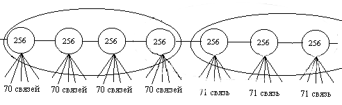Прирост клаттеров за цикл с этого момента при постоянстве времени цикла идет уже по другой, как мы покажем далее, гораздо более быстрой гиперболе. Т. е. процесс роста сети претерпевает качественный скачок. Допустим, что сеть выросла до размера 71, т. е. содержит 71 клаттер. Для фрагмента сети, изображенного на рисунке, имеем следующее: после копирования четырех клаттеров (длина звена = 4) получаем (70 + 1)*4 = 284 носителя. Здесь, также как на первом этапе роста, возможны первые три варианта финализации звена: по минимуму, по максимуму и средний между первым и вторым. Длина звена равна четырем (по первому варианту).