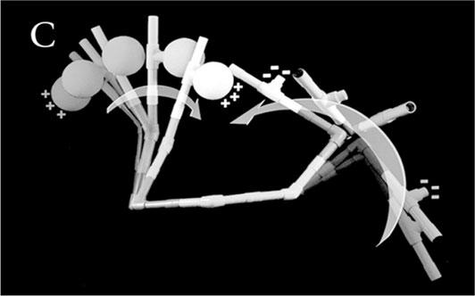 На первом рисунке (стр. 72) А представляет собой предпочтительную конформацию нашей гипотетической белковой цепи. Силы отталкивания между двумя отрицательно заряженными концевыми аминокислотами (обозначены стрелками) заставляют цепь растягиваться так, чтобы эти аминокислоты оказались как можно дальше друг от друга. B – это концевая аминокислота крупным планом. Сигнал – в данном случае молекула, имеющая большой положительный заряд (белый шарик), притягивается к отрицательно заряженному участку концевой аминокислоты и связывается с ним. В этом конкретном случае положительный заряд сигнала больше отрицательного заряда аминокислоты. После того как он связывается с белком, на соответствующем конце цепи образуется избыток положительного заряда. Поскольку положительный и отрицательный заряды притягиваются, аминокислоты белковой цепи станут поворачиваться относительно соединяющих их связей так, чтобы положительно и отрицательно заряженные концы сблизились. C демонстрирует переход от конформации А к конформации B. Изменение конформации порождает движение, которое используется для выполнения полезной работы – в частности, для осуществления таких функций, как пищеварение, дыхание и сокращение мышц. Когда сигнал отделяется, белок возвращается к своей предпочтительной вытянутой конформации. Так сигнально-обусловленное движение белковых молекул делает возможными процессы жизнедеятельности.