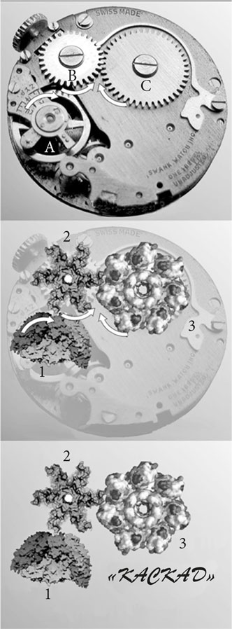 На второй иллюстрации (перед вами) функционирование клетки демонстрируется на примере механических часов. Вверху показан металлический механизм с его шестеренками, пружинами, камнями и корпусом. Поворачиваясь, шестеренка А заставляет поворачиваться шестеренку B, шестеренка В – шестеренку С и так далее.