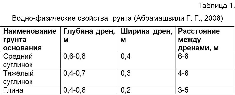Перед тем, как начинать разработку системы дренажа, необходимо понять, на каком грунте будет создаваться газон. Для нас важно понять необходимую глубину залегания дрен, ширину дрен и расстояние между ними. Эти данные приведены в таблице 1.