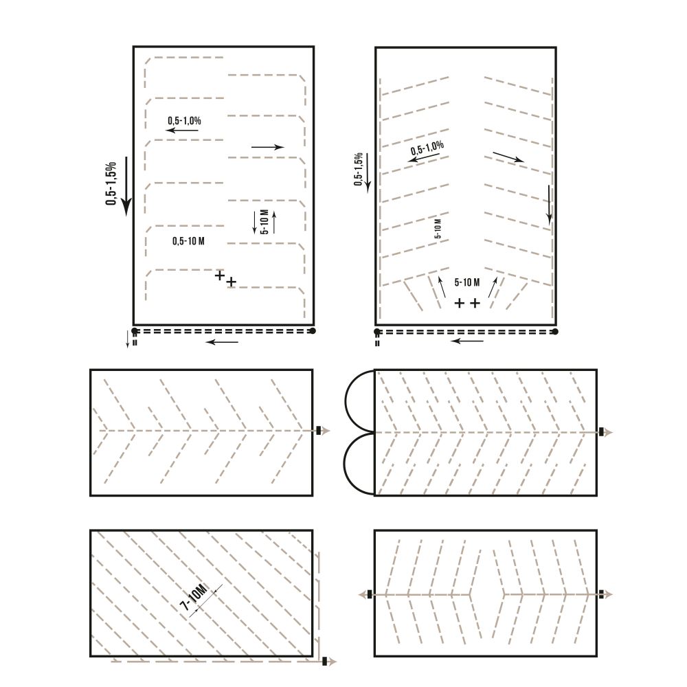 Схемы расположения дрен могут быть разнообразные, примеры приведены на рисунке 1. Всё зависит от рельефа участка и расположения поселкового дренажа, куда будет отводиться вода из дренажной системы.