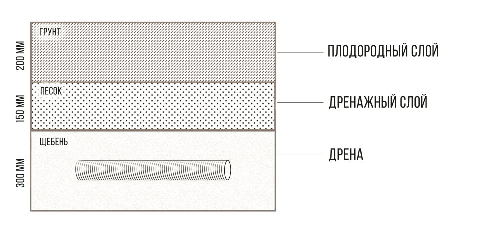 На этом этапе необходимо принять решение о создании дренажной системы. Дренаж отводит излишки воды и способствует лучшему развитию газонных трав на участке. Излишняя влага приводит не только к тому, что газон будет плохо переносить зимний период: он и весной будет трогаться в рост намного позже участков с нормальным уровнем увлажнения. Избыток влажности также вызывает сильное переуплотнение почвы, деформацию почвенного покрова, травы становятся более чувствительными к различным заболеваниям.