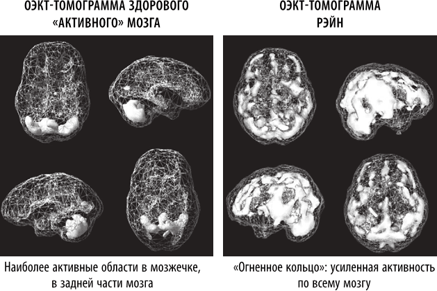ОЭКТ-томограмма Рэйн выявила сильную аномалию. У нее был так называемый «паттерн огненного кольца», который характеризуется чрезмерной активностью всего мозга, особенно в области передней поясной извилины. Это означало, что она зацикливается на негативных мыслях и поступках. Было легко называть ее плохой девочкой, пока мы не увидели, в каком состоянии находился ее мозг. Мозг ребенка был постоянно перенапряжен, оставляя ей слишком мало возможностей для контроля над своим поведением. Мы назначили Рэйн специальные добавки, чтобы успокоить ее мозг, организовали ей посещение нейротерапевта и изменили ее рацион, исключив глютен и молочные продукты.