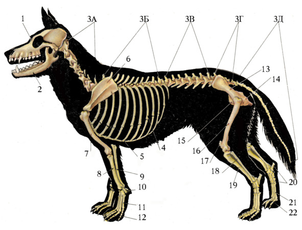 1 – череп; 2 – нижняя челюсть; 3 – позвоночный столб (3А – шейный; 3Б – грудной; 3В – поясничный; 3Г – крестцовый; 3Д – хвостовой); 4 – ребро; 5 – грудная кость; 6 – лопатка; 7 – плечевая кость; 8 – лучевая кость; 9 – локтевая кость; 10 – запястье; 11 – пясть; 12 – пальцы; 13 – подвздошная кость; 14 – седалищная кость; 15 – лонная кость; 16 – бедро; 17 – коленная чашечка; 18 —малая берцовая кость; 19 – большая берцовая кость; 20 – предплюсна; 21 – плюсна; 22 – пальцы.