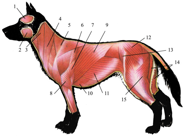 1 – лобная; 2 – жевательная; 3 – грудинно-щитовидная; 4 – плечеголовная; 5 – трапецевидная; 6 – дельтовидная; 7 – плечевая; 8 – трехглавая; 9 – широкая; 10 – грудная; 11 – брюшная наружная; 12 – ягодичная; 13 – напрягатель фасции бедра; 14 – полусухожильная; 15 – двухглавая бедра.