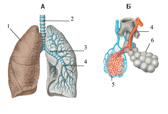 1 – легкое; 2 – трахея; 3 – бронхи; 4 – мелкие бронхи; 5 – капиллярная сеть; 6 – альвеолы.