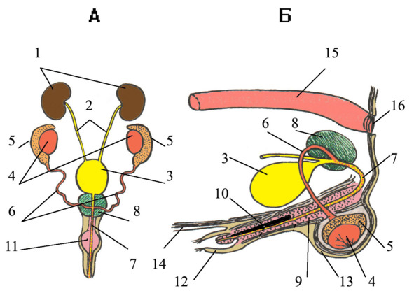 1 – почки; 2 – мочеточники; 3 – мочевой пузырь; 4 – семенники; 5 – придатки семенника; 6 – семяпроводы; 7 – мочеполовой канал; 8 – предстательная железа; 9 – пещеристое тело; 10 – косточка пениса; 11 – луковица головки; 12 – крайняя плоть (препуций); 13 – мошонка; 14 – брюшная стенка; 15 – кишка; 16 – анальное отверстие.