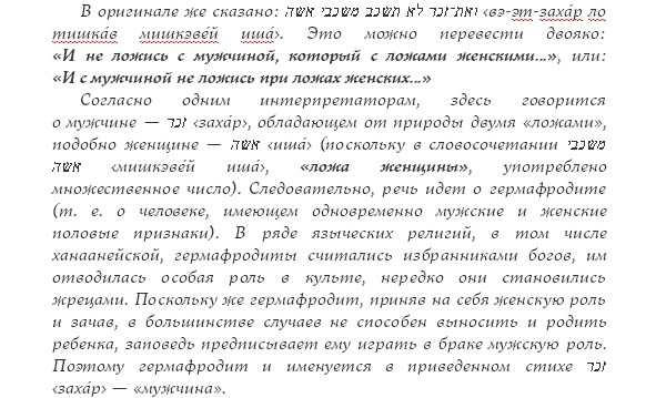 «Особо стоит вопрос о гермафродитизме. Речь идет о стихе, который в Синодальном переводе передан так: Не ложись с мужчиною, как с женщиною: это мерзость. (Лев. 18, 22 [, см. также 20:13])