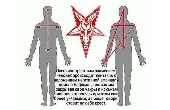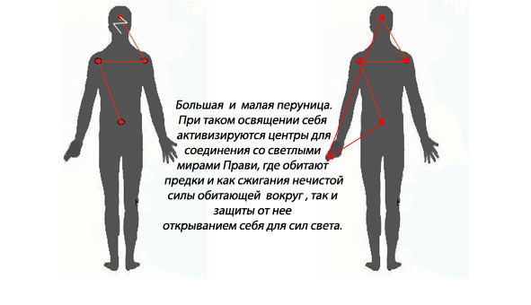Для сотворения Святого знамения три перста правой руки (большой, безымянный и малый) концами соединяются вместе в честь Великого Триглава Мира Яви – Сварога, Перуна и Свентовита, которые есть суть – Совесть, Свобода (Воля) и Свет, а два перста (указательный и средний) соединяются прямыми вместе и означают Род Небесный и Ладу-Богородицу. Полагались два перста на чело, потом левый глаз, правый глаз и затем уста – МАЛАЯ ПЕРУНИЦА или на чело затем на левое плечо, потом правое и потом центр чрева на пуп это БОЛЬШАЯ ПЕРУНИЦА, движения руки шли от стороны сердца слева направо. В движении руки получалась молния. При правлении Романовых это знамение было отменено, и начался раскол в Русском православии, как нам повествуют поддельные исторические знания. Поддельные, потому как раскол был с того времени, когда приняли христианство Киевская и Московская Русь. При крещении нынешнего лжеправославия трехперстном получается пентакль – перевернутая и не перевернутая пятиконечная звезда сатанинский символ, появившийся еще со времен шумер, ниже будет рассказано об этом. На рисунках Мудра и движение руки при трехперстном крещении, которое по себе есть подмена образа.
