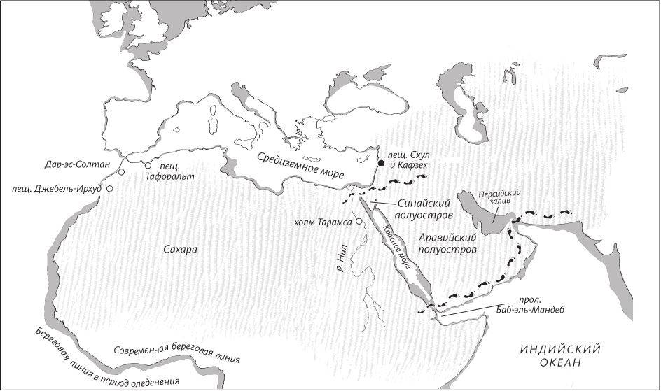 В книге «Изгнание из Эдема» Стивен Оппенгеймер рассмотрел вероятность каждого из этих маршрутов как отправную точку исхода современных людей из Африки с учетом климатических условий и окружающей среды [8]. Большую часть плейстоцена северный путь из Африки был «закрыт» из-за холодного и засушливого климата и непроходимых пустынь Сахара и Синай. Но приблизительно каждые 100 тыс. лет ледниковый период прерывался межледниковьем, и тогда на время становилось теплее и возвращались муссоны. В течение этих периодов некоторые прежде пустынные территории оживали. Яркое описание Оппенгеймером этого события напоминает фантастический сюжет фильма «Звездные врата». Животные Черной Африки могли уйти на территории бывших пустынь, расширяя ареал обитания от экваториальных областей до умеренных зон. Африканская фауна могла переместиться вверх, в Левант, пройдя по зеленому природному «коридору» прямо через полуостров Синай [9].