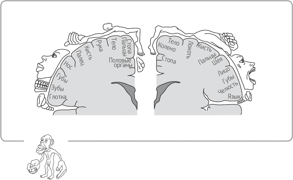 Авторство этих рисунков принадлежит нейрохирургу Уайлдеру Пенфилду. Здесь отражена как бы карта диппредставительств в деловом центре города, если представить, что кора мозга с двигательной и чувственной функцией – это город, а страны, посылающие своих дипломатов, – это разные органы тела человека. Как вы можете видеть, области представительства кисти с пальцами занимают необычайно большое место на коре головного мозга.