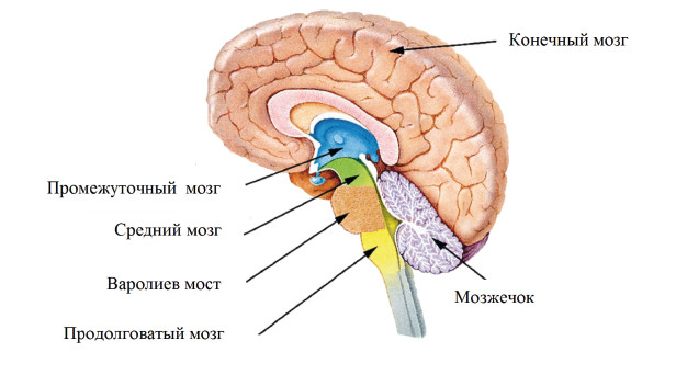 Рис. 2. Отделы головного мозга (сагиттальный срез).