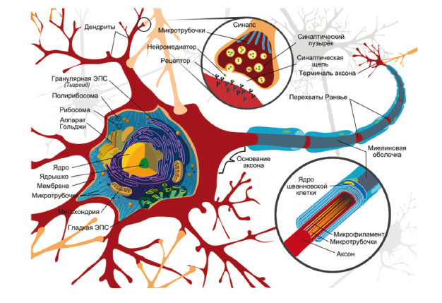 Нервная клетка состоит из сомы (тело клетки) и отходящих от нее отростков (рис. 3). Размер сомы у разных нейронов может отличаться в десятки раз: от 5 до 150 мкм. Сома заполнена цитоплазмой, в которой располагаются ядро клетки и органеллы. От тела отходят многочисленные короткие ветвящиеся отростки, которые называются дендриты, а также один длинный отросток, который называется аксон. Дендриты представляют собой короткие трубчатые выросты толщиной менее 1 нм. Диаметр аксона составляет у разных клеток от 1 до 6 мкм, а длина может достигать метра и более. На своем конце аксон делится на множество ответвлений – аксонных терминалей, каждая из которых заканчивается утолщением – синаптической бляшкой. Синаптической бляшкой аксонная терминаль контактирует с дендритом или сомой другого нейрона, образуя межклеточный контакт – синапс.