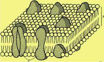 Рис. 4. Липопротеидная мембрана нейрона.1 – двойной слой липидов, 2 – белковые молекулы