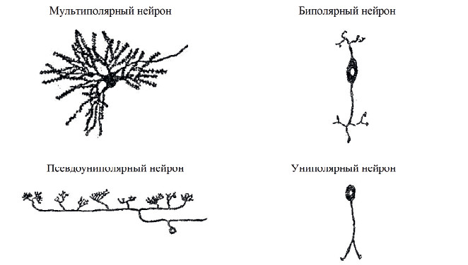 Нервные клетки классифицируются по характеру отростков на 4 типа (рис. 5): мультиполярные, биполярные, псевдоуниполярные и униполярные. Самыми распространенными являются мультиполярные клетки – типичные для ЦНС нейроны. Они состоят из тела, дендритного дерева и аксона. Биполярный нейрон имеет продолговатое тело, с одной стороны которого отходит дендрит, а с другого – аксон. Такие клетки встречаются лишь в сетчатке глаза, а также в слуховом и вестибулярном ганглиях. Псевдоуниполярные нейроны формируют спинальные ганглии (утолщения задних корешков спинномозговых нервов). От шарообразного тела такой клетки отходит один отросток, который Т-образно делится на две ветви: одна направляется к периферии, другая входит в спинной мозг. Такого же типа нейроны располагаются в чувствительных ядрах черепномозговых нервов.
